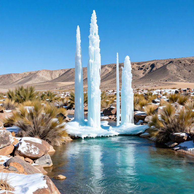 Icy columns stand majestically along a tranquil turquoise stream, their translucent forms reflecting sunlight as they rise from a desert landscape dotted with resilient shrubs and snow-capped rocks.