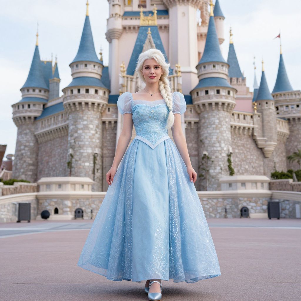 Original Elsa Dress, a woman in a blue dress standing in front of a castle