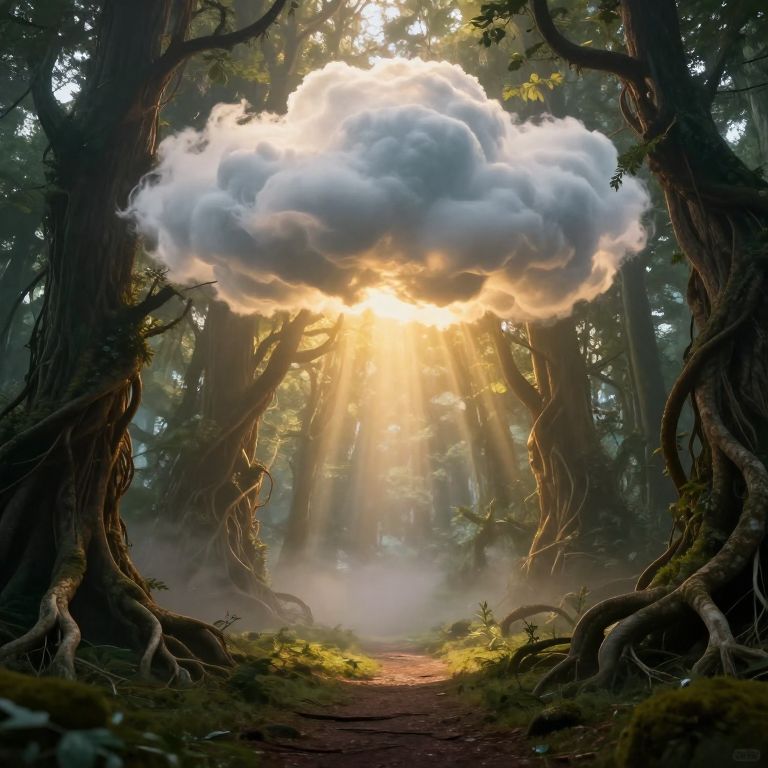 Photorealistic digital artwork of a sunlit forest, with a large, glowing cloud hovering above a dirt path, surrounded by twisted, ancient trees.