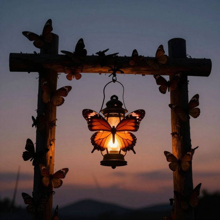 Silhouetted against the twilight sky, a macabre structure of two wooden posts and a horizontal beam is adorned with numerous butterflies, while a glowing butterfly lantern hangs centrally, casting an eerie orange light that illuminates its intricate wings and symbolizes the haunting fusion of life and decay.