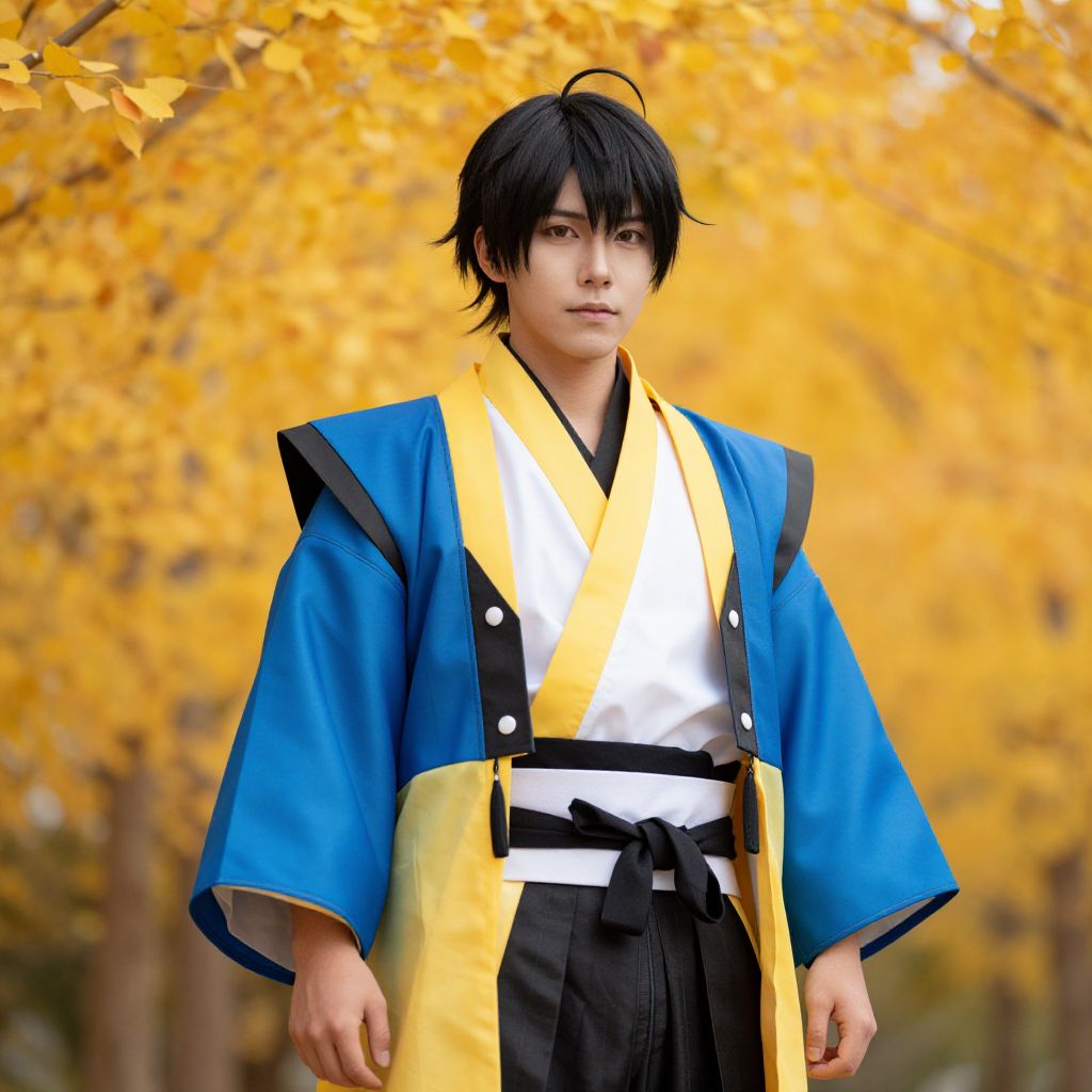 A photograph of an Asian male cosplayer with black, slightly messy hair, wearing a traditional Japanese kimono-style outfit. The kimono is blue with yellow and black accents, featuring a white inner shirt and black hakama pants. He stands against a backdrop of bright yellow autumn leaves, with the sunlight filtering through the trees. His expression is neutral, and he looks slightly to the side. The overall composition is vibrant and contrasts the colorful kimono with the golden foliage. The image is crisp and well-lit, emphasizing the vivid colors and textures.