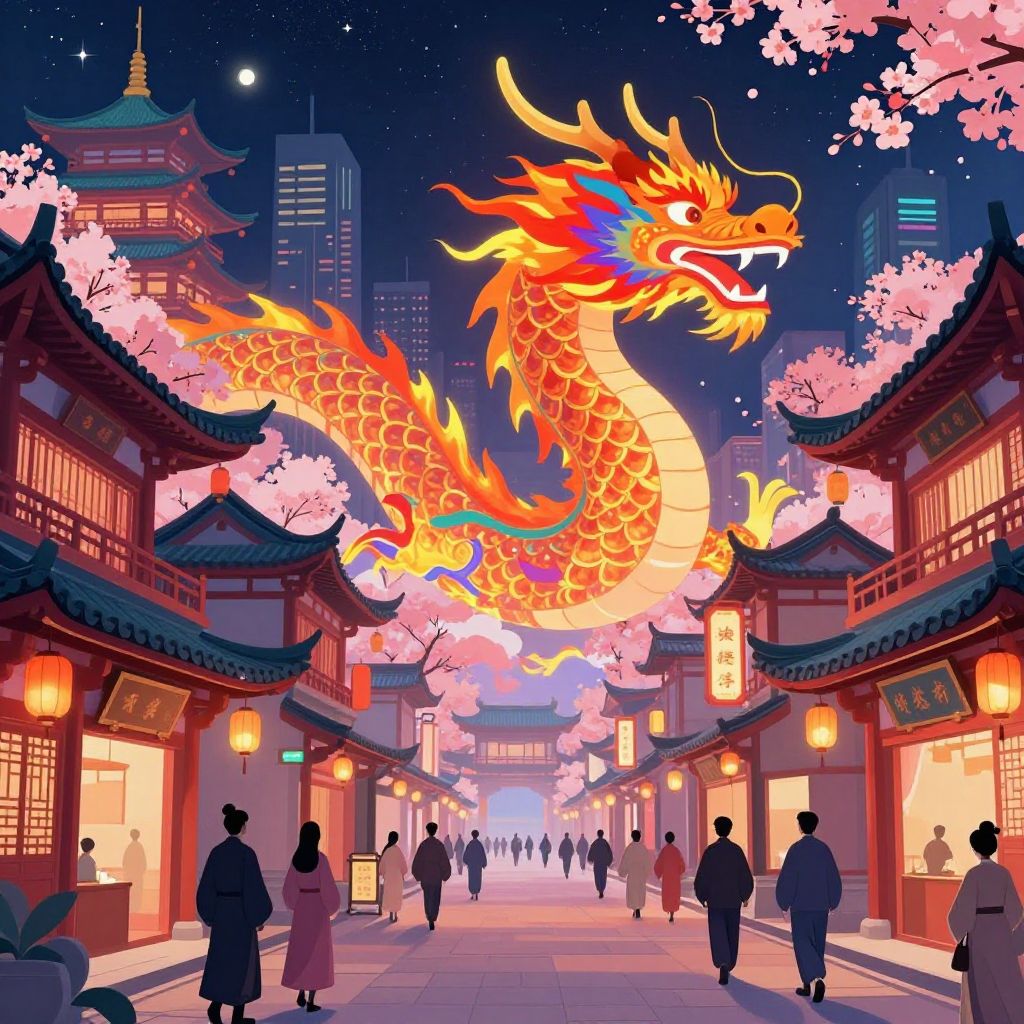 Digital illustration of a traditional Asian street at night, featuring colorful pagoda-style buildings and neon-lit signs. A large, vibrant dragon with radiant scales and flames weaves through the skyline under a starry sky, surrounded by pink cherry blossom trees. Silhouettes of people in traditional attire walk along the street, blending culture and fantasy in a vivid, dynamic scene.