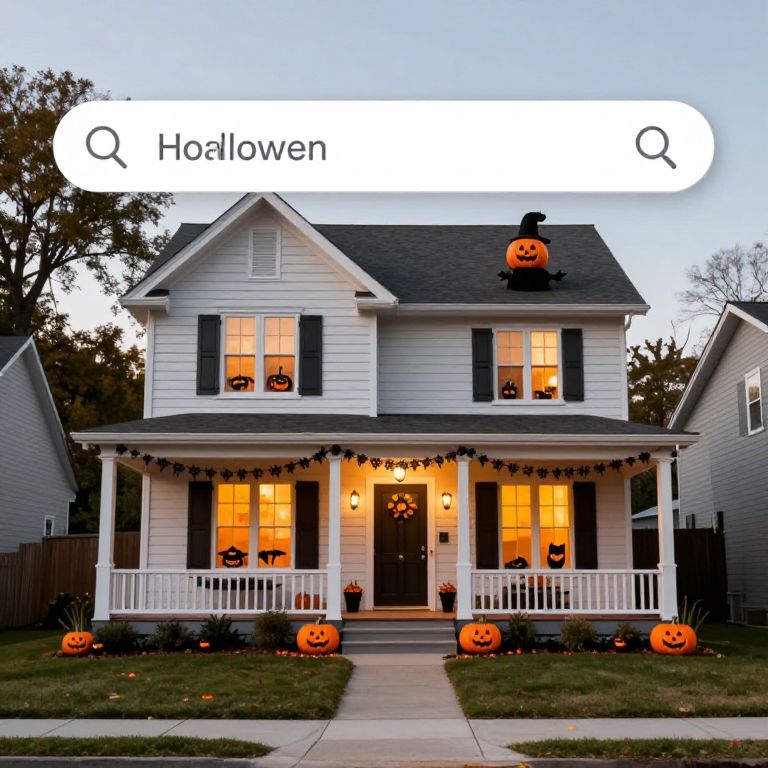 Photograph of a two-story white house with black shutters and a dark grey roof at dusk. The front porch is adorned with orange jack-o'-lanterns on the steps and in the front yard. Warm yellow lights glow from the front windows and door, creating a welcoming Halloween atmosphere. Black garland with orange accents is draped along the porch roof. The house is surrounded by a small, well-maintained lawn with trees in the background. A Google search bar is overlaid at the top, with "Halloween" as the search term. The overall scene is festive and cozy.