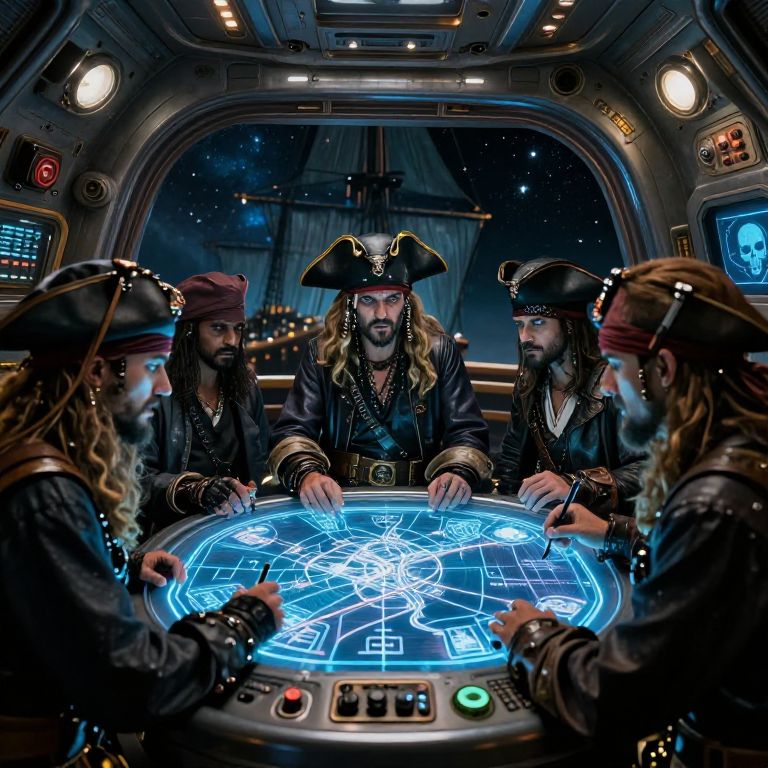 AI pirate crew gathered around a holographic treasure map inside a spaceship shaped like an old galleon, with blinking control panels and futuristic gadgets, high-tech skull insignias, moody lighting with metallic textures and a starry outer space backdrop.