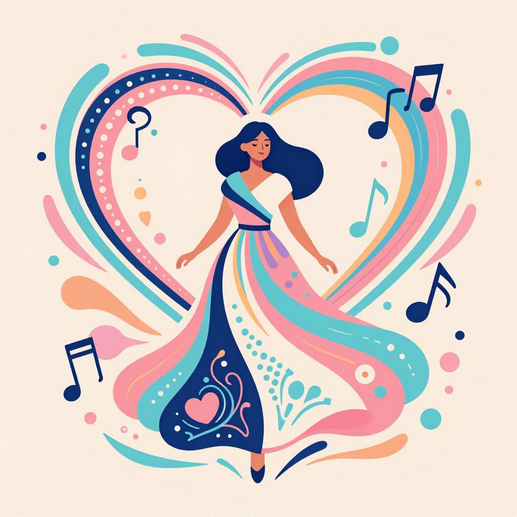 A vibrant, abstract vector art illustration of a woman in a flowing dress, surrounded by a heart-shaped design, symbolizing love and music, with intricate patterns and pastel colors.