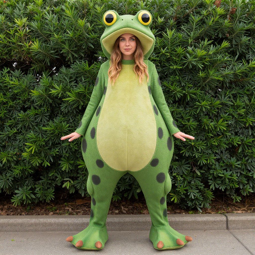 "Woman Toad Costume, woman in a costume that is standing in front of a plant"