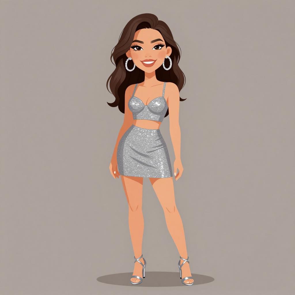 This is a digital drawing of a stylized, attractive woman with long, wavy black hair and light brown skin. She is wearing a silver sequin crop top and matching mini skirt, both with thin straps, and white high-heeled sandals. Her makeup includes dark eyeliner and red lipstick. She is standing with one hand on her hip and the other relaxed by her side. She also wears large, silver hoop earrings. The background is plain white, making the character stand out prominently. The style is cartoonish with bold outlines and vibrant colors.
