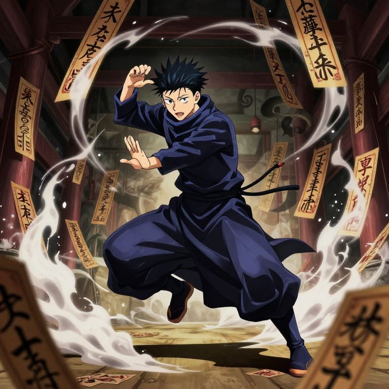 Jujutsu Kaisen concept art depicting a mysterious sorcerer training in an ancient dojo surrounded by cursed talismans, smoky mystical aura, stylized anime-inspired art, emphasis on motion and expressive poses, dramatic shadows and contrasts.
