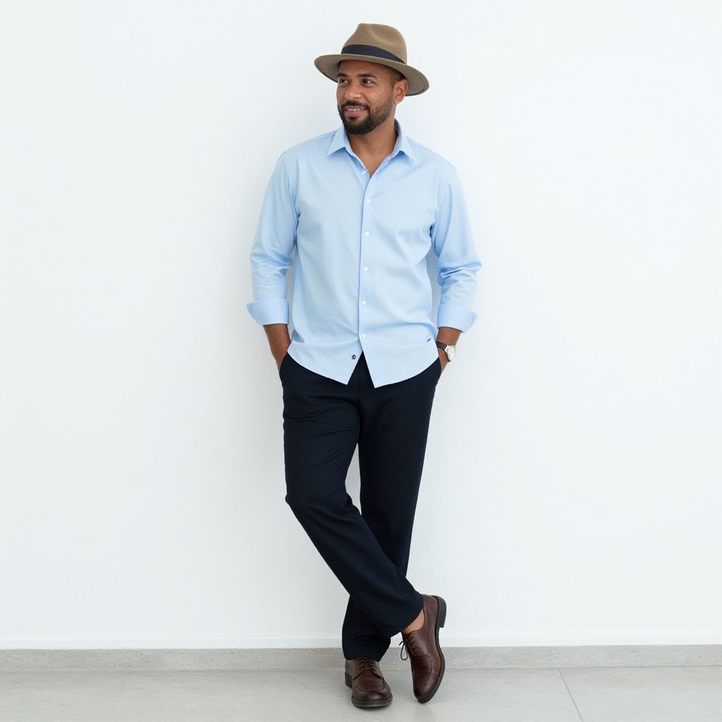A man wearing a light blue button-up shirt, dark pants, and brown leather shoes stands casually with his hands in his pockets, smiling against a plain white wall. He accessorizes his outfit with a stylish tan fedora, creating a laid-back yet polished look.