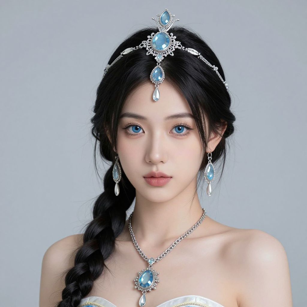 Harfoot costume, 1girl, solo, jewelry, necklace, realistic, earrings, braid, looking at viewer, black hair, upper body, long hair, lips, headdress, blue eyes, single braid