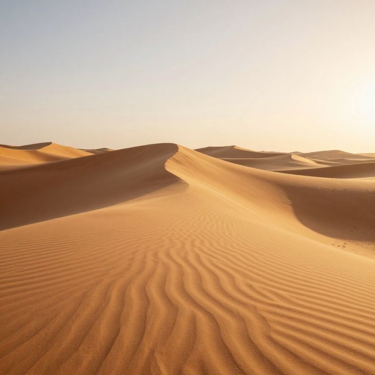 Photograph of golden desert sand dunes under a bright, clear sky at sunset. Ripples in the sand catch the sunlight, creating a pattern of