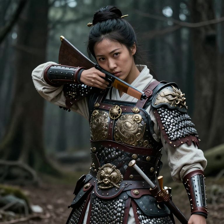 Photograph of a focused Asian woman with dark hair in a bun, wearing a detailed, dark-patterned robe, against a blurred, dark, mo