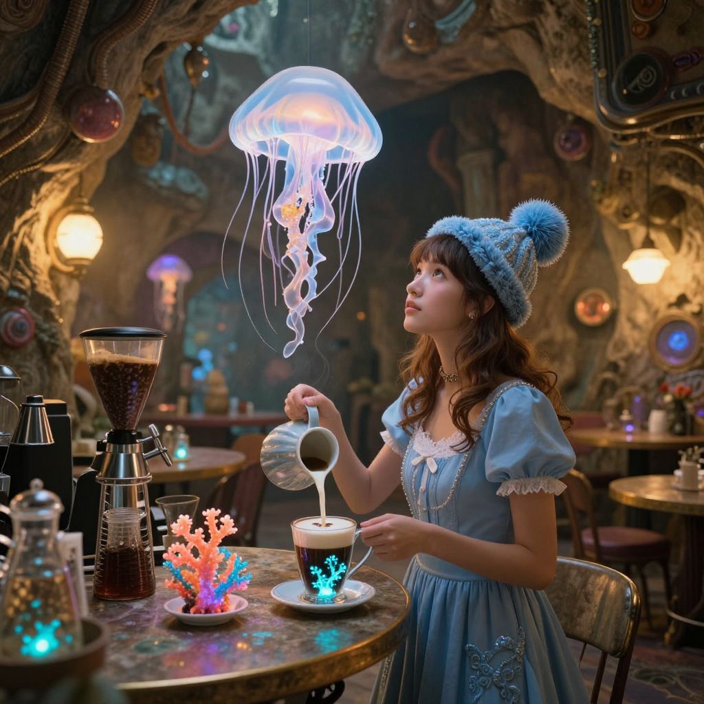 In a surreal, cyberpunk-inspired café nestled within a cavernous interior, a luminous jellyfish floats serenely above as a young woman in a blue dress and pom-pom hat prepares dream-brewed coffee in cups crafted from bioluminescent coral, illuminated by ambient golden-hour lighting and surrounded by whimsical, otherworldly decor.