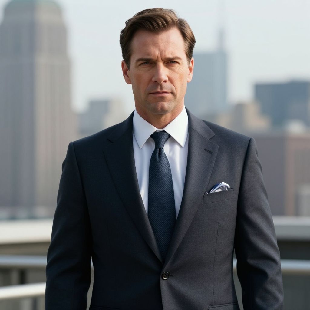 The image features a man dressed in a stylish Foggy Nelson costume, exuding sophistication against a backdrop of an urban skyline. His tailored suit, complete with a tie and pocket square, embodies the essence of the character known for his sharp intellect and legal expertise.