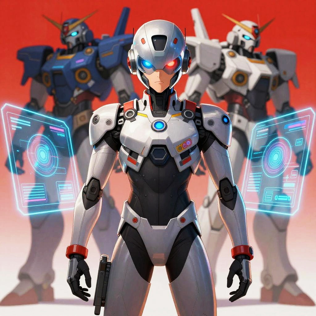 Make an anime character resembling a futuristic mech pilot with sleek helmet and suit, surrounded by holographic interfaces and giant robots in the background, bold colors, sharp lines, sci-fi anime aesthetic