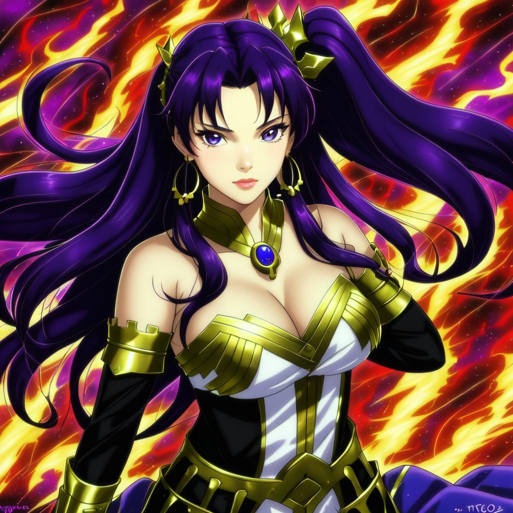 Digital anime-style illustration of a fierce female warrior with long purple hair tied into a side ponytail, violet eyes, and elegant gold and black armor. The character features large breasts and a detailed corset with metallic accents, set against a vibrant background of swirling flames, evoking a powerful and intense atmosphere.