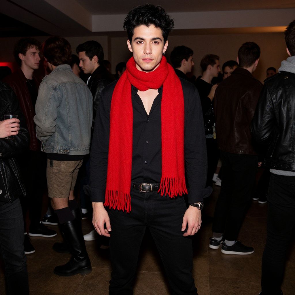 "costume character parties, multiple boys, scarf, red scarf, pants, jacket, boots, black hair, facial hair, shirt Realistic photo of casual sexy person with pretty face"