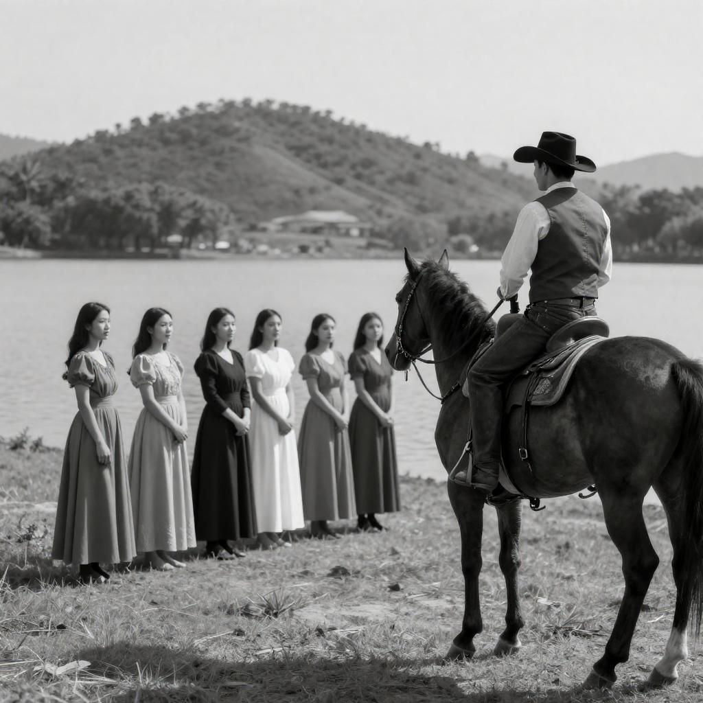Black-and-white photograph of six people in 19th-century Western attire standing in front of a cloudy sky. Central man wears a cowboy hat, plaid shirt, and vest, holding a lantern. Surrounding people, dressed in long dresses and aprons, also hold lanterns. Rocky landscape in background. All stand on a rocky surface, facing forward. Facial expressions neutral. Three men, three women. Lanterns glow softly.