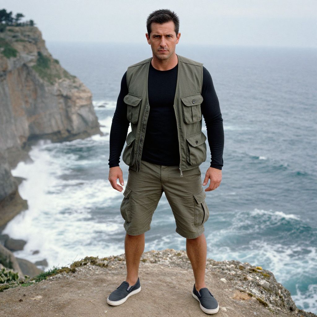 A man, olive green utility vest, fitted black long-sleeve shirt, tapered cargo shorts, dark grey slip-on sneakers, coastal cliff edge, crashing waves below, AgfaColor film, focused expression, adventurous spirit. Man has masculine face and piercing eyes
