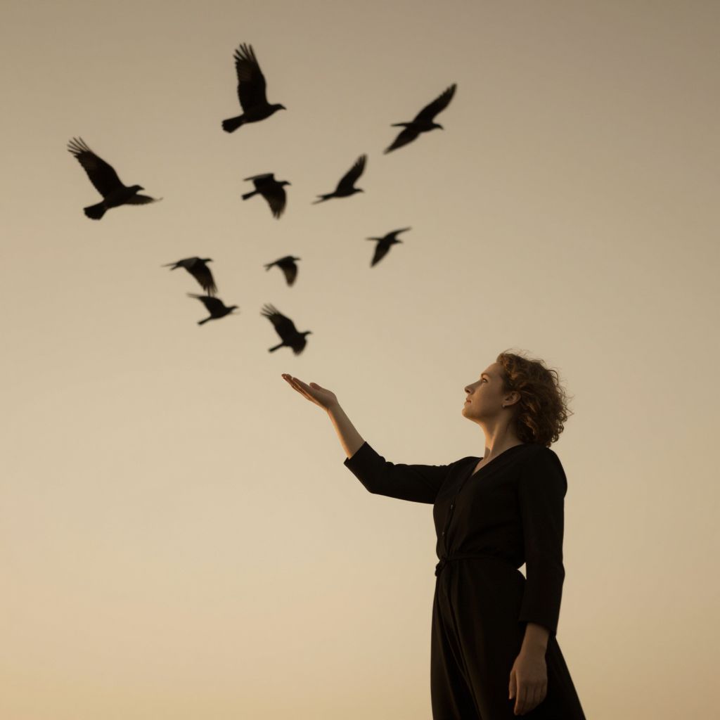 Photograph of a silhouetted woman with curly blonde hair, dressed in a black long-sleeve top, standing against a gradient sunset sky. She raises her right hand, palm open, as a flock of black birds flies towards her from the top left. The birds are in mid-flight, creating a dynamic contrast against the soft, warm background. The woman's profile is visible, with her gaze directed upward, adding a sense of anticipation and connection with nature. The overall composition emphasizes a serene yet captivating interaction between the human and avian elements.