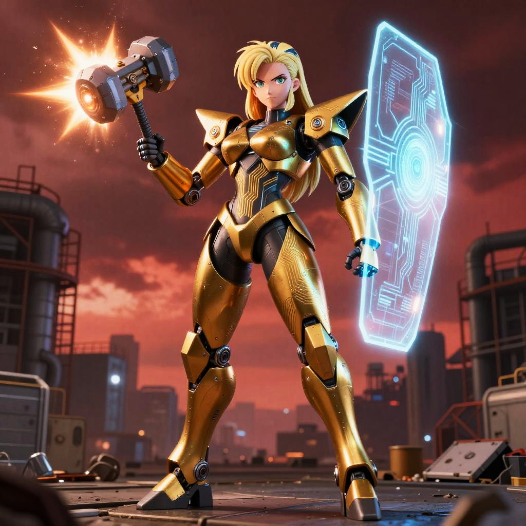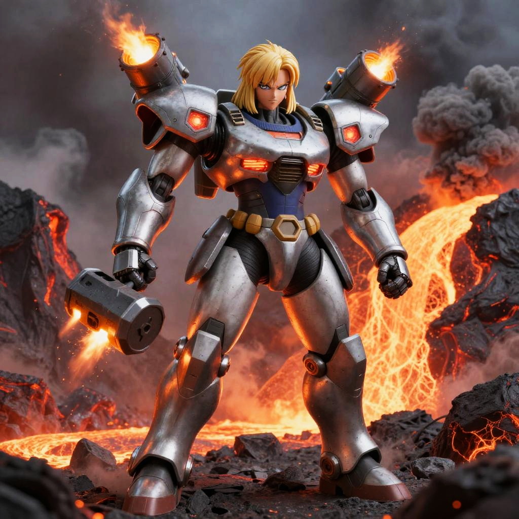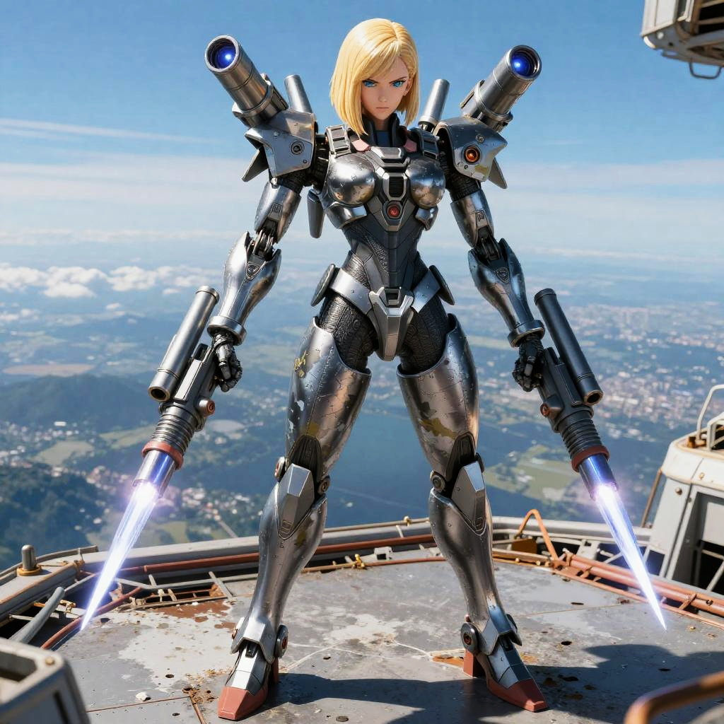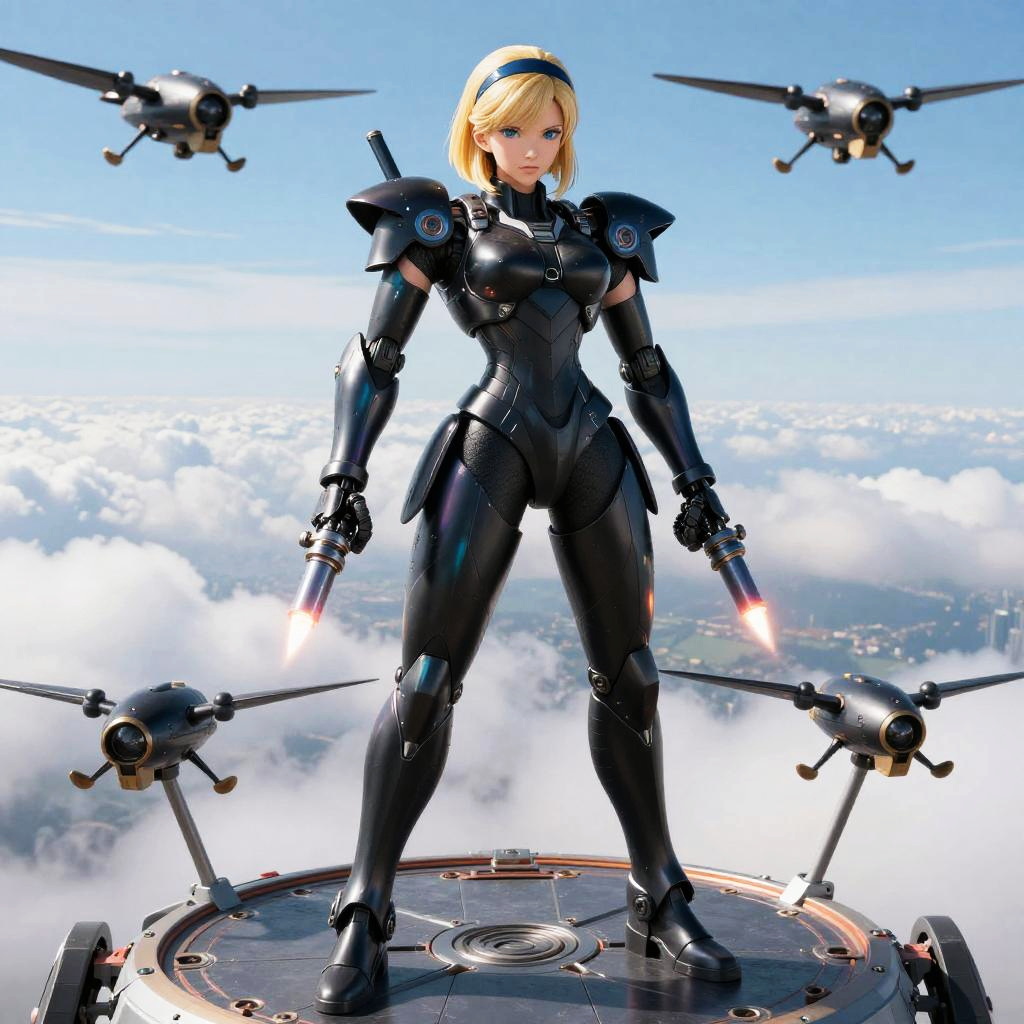 A mecha-inspired Android 18, with exoskeletal framework featuring enhanced mobility gear and reinforced claws with kinetic energy shockwave projectors, drone support systems, standing tall in a deep space launch ground surrounded by starry void.