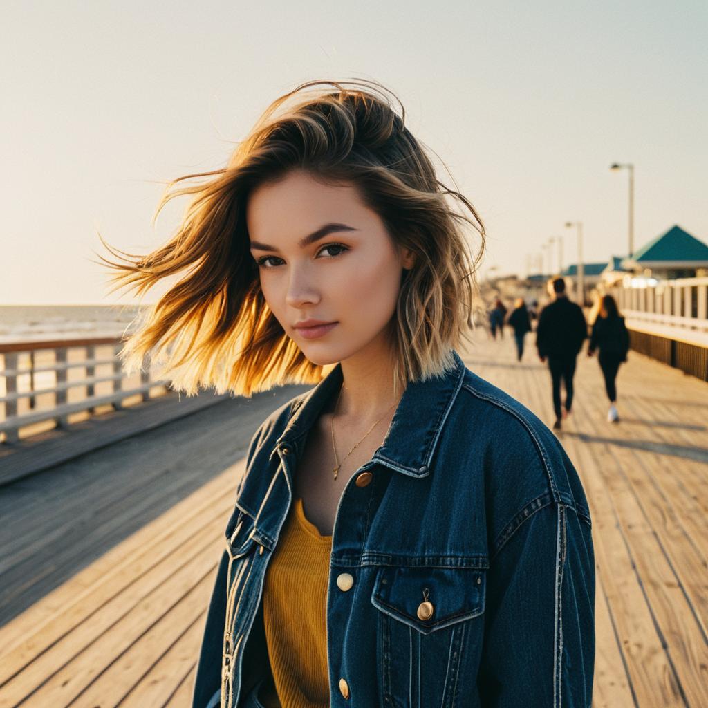 Lowlights hairstyle on fashion model, wearing casual jacket, in beach boardwalk, captured in fashion editorial style with natural golden hour.