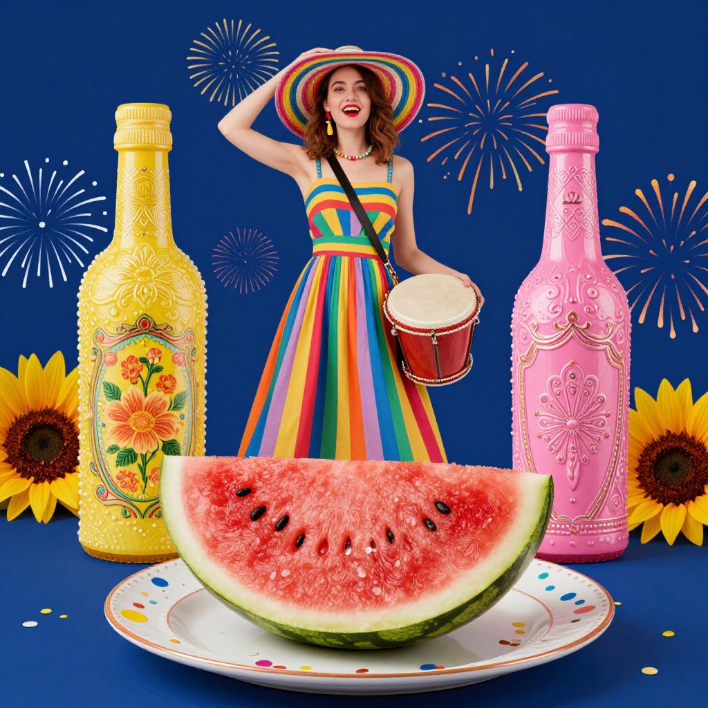 Vibrant Fiesta Collage by Liz Nehdi showcases a whimsical scene featuring a woman in a colorful striped dress and wide-brimmed hat, standing between two intricately decorated bottles—one yellow and floral, the other pink and ornate—while holding a small drum. In the foreground, a large, festive watermelon slice rests on a plate adorned with confetti-like dots, surrounded by bursts of fireworks and sunflowers against a deep blue background, creating a lively and celebratory atmosphere.