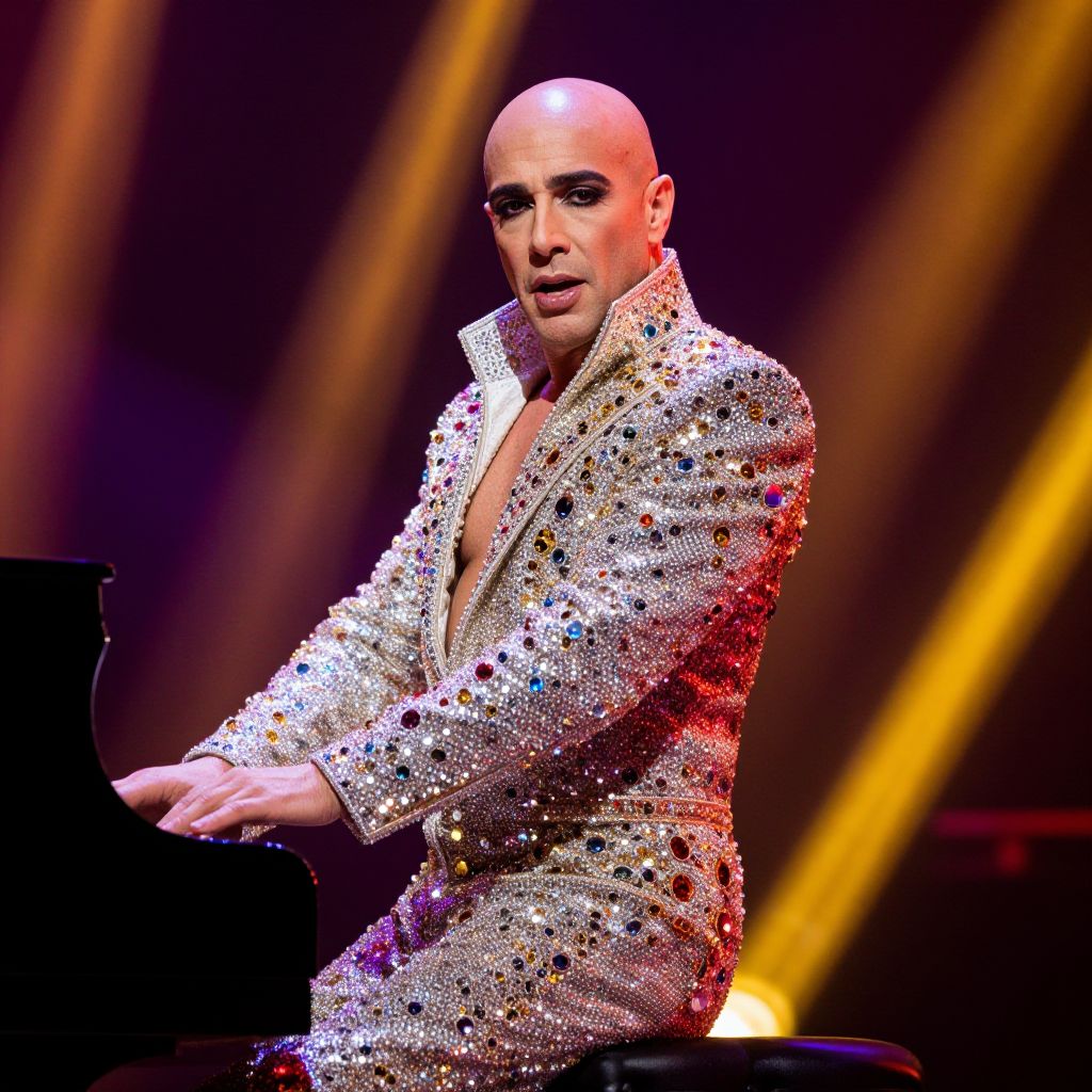 Chippendales inspired male revue show on stage, vibrant spotlighting highlighting muscular performers mid-dance, stylish black and white costume elements like cuffs and collar, energetic crowd silhouettes in the background, rich color saturation and dynamic composition.