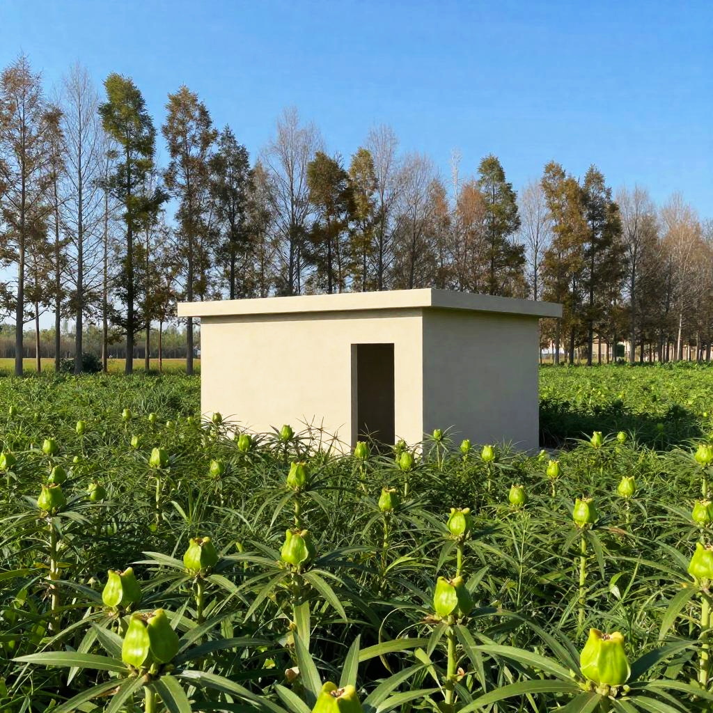 This is a digital art piece featuring a small, beige, rectangular building with a flat roof, nestled in the center of a lush green field filled with tall, green plants and unripe green spheres. Behind the field, there's a row of tall, slender, leafless trees stretching into a clear, vibrant blue sky. The image has a surreal, slightly exaggerated style with bold colors and stark contrasts.