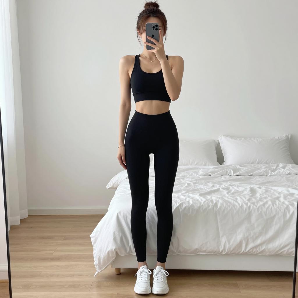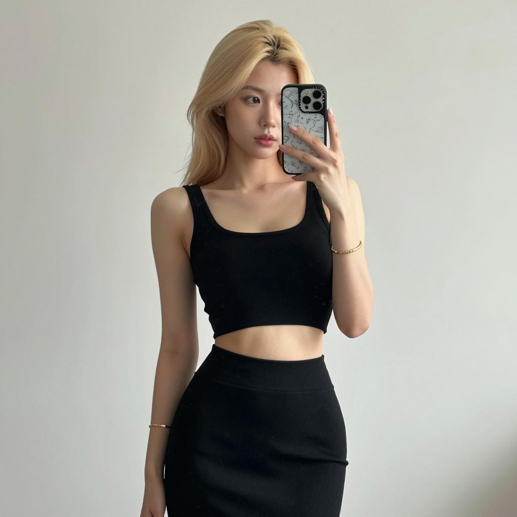 Young woman with light skin and blonde pigtails, wearing a black cap, gray crop top, and black skirt, taking a mirror selfie with a smartphone. Her right arm is slightly raised, phone in hand. Unmade bed in the background. Her face is mostly obscured by the phone.