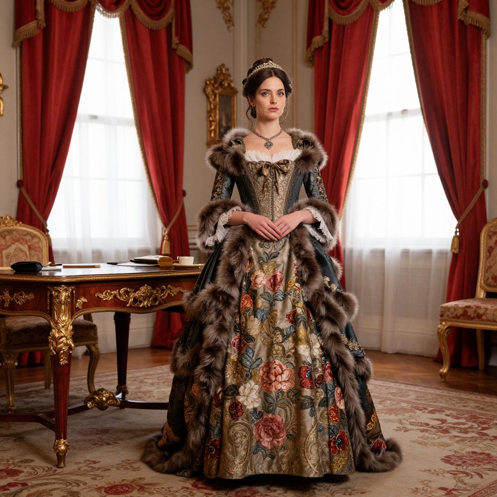 Photograph of a fair-skinned woman with dark brown hair styled in an updo, wearing an elaborate 18th-century style red and cream gown with white lace trim. The red bodice features white floral appliqués and a low, square neckline, while the cream skirt has intricate patterns. She stands in a richly decorated, dark wood-paneled room with heavy red velvet curtains in the background. Her right hand is elegantly raised, and she wears matching white floral earrings. The overall setting evokes a regal and historical atmosphere.