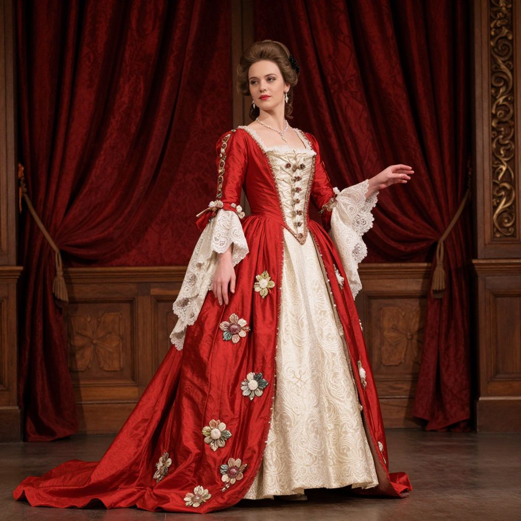 Elegant figure draped in a flowing red and cream gown, adorned with intricate lace details and floral embellishments, stands gracefully against a backdrop of richly textured red curtains and ornate wooden paneling, evoking the opulent atmosphere of a historical opera performance.