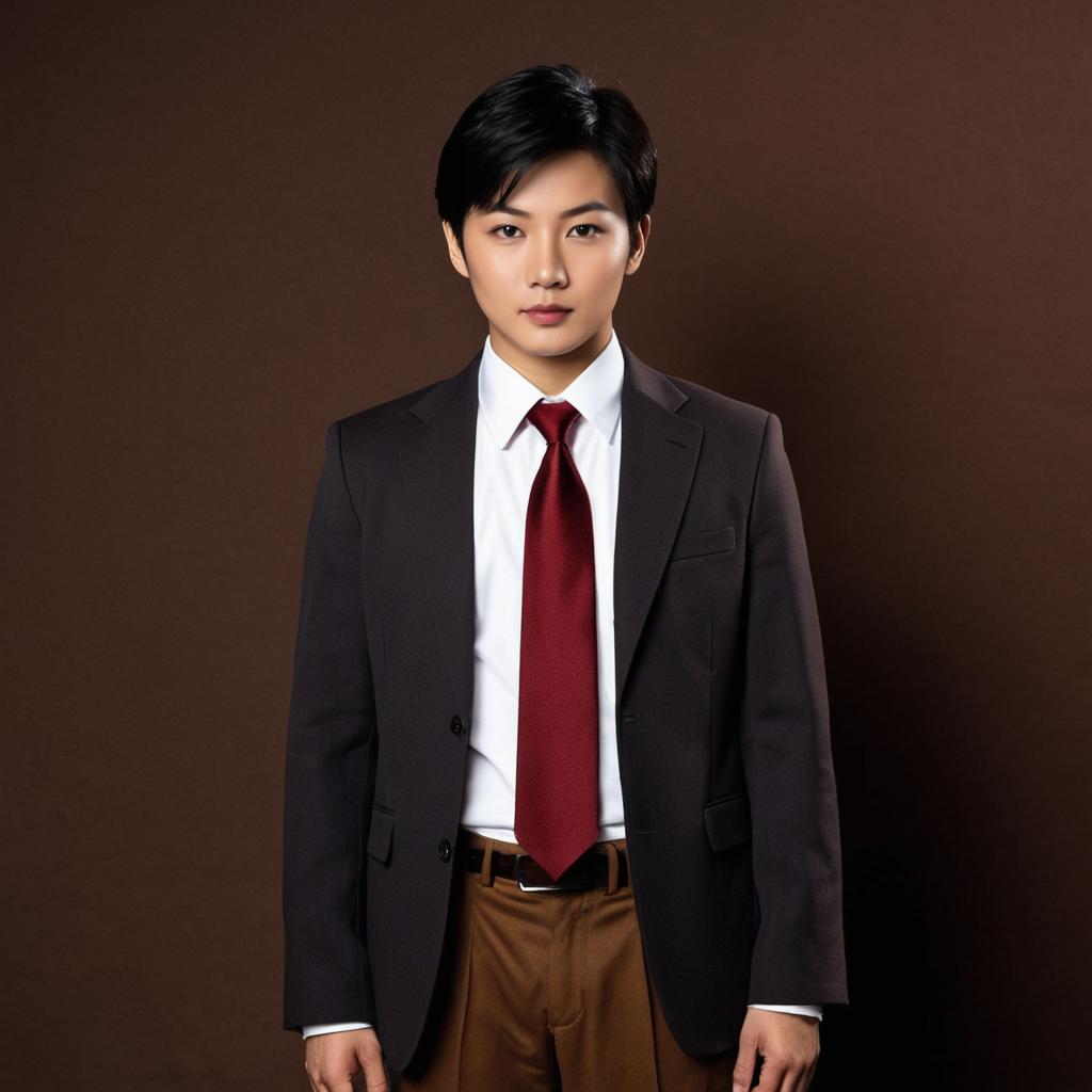 Portrait of an Asian young man with black hair wearing a formal black suit jacket, white collared shirt, red necktie, and brown pants standing against a brown background. He is facing forward with a neutral expression and arms at his sides.