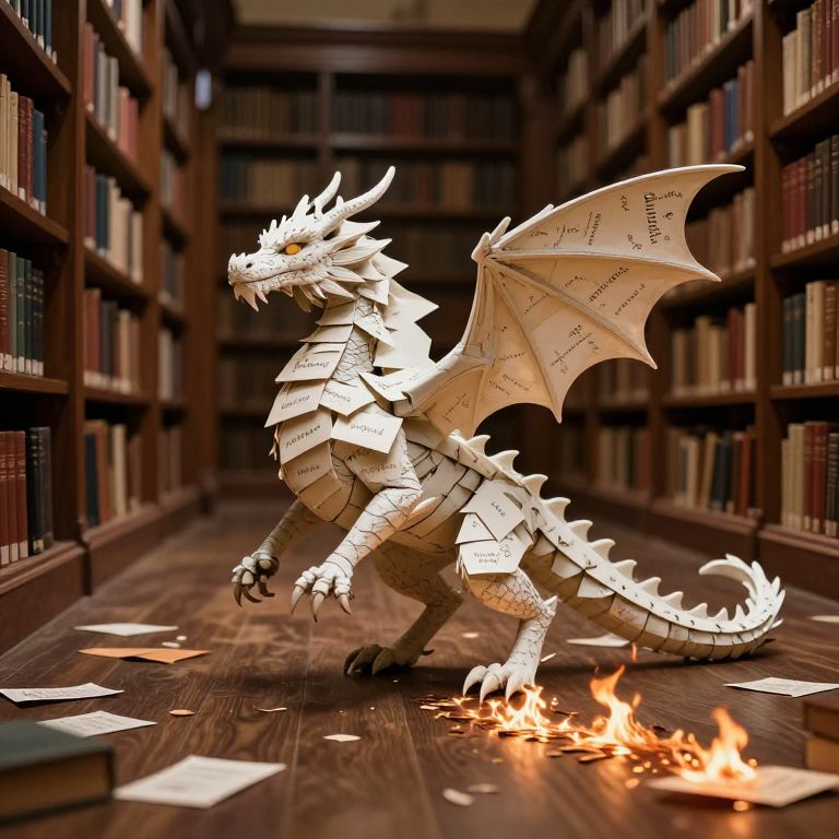 In a library of impossible stories, a dragon made solely of unsent letters to lovers stomps gracefully across the floor, leaving trails of fiery sonnets.