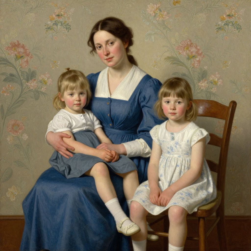 G. Frederick Clement's portrait painting titled *The Artist's Wife and Children* depicts a serene domestic scene featuring a woman seated with two children, one cradled in her lap and the other sitting on a wooden chair to her right, all set against a floral wallpaper backdrop.