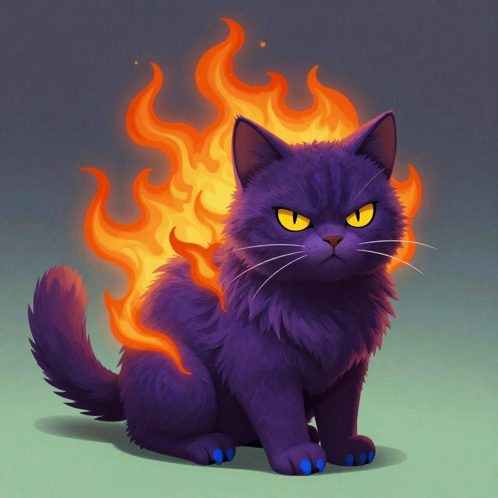 A digital artwork of a fluffy, dark purple cat with fiery orange flames erupting from its back and sides. The cat has intense, yellow, slit-pupil eyes and a serious expression. Its fur is textured and lush, with a gradient background that transitions from dark gray to light green. The cat's claws and paws are blue, adding a contrast to its vibrant appearance. The overall style is whimsical and fantasy-inspired.