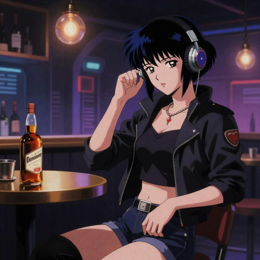 Anime-style digital drawing of a black-haired woman in headphones, black crop top, and shorts, sitting at a bar table with a Jack Daniel's bottle
