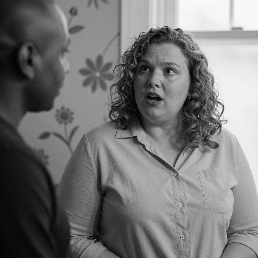 Black and white photograph of a heavyset woman with curly, light-colored hair, wearing a light-colored, buttoned shirt. She is speaking to a bald man with dark skin, partially visible on the left. Floral-patterned wall background, window behind her. She has an open-mouthed, expressive look.