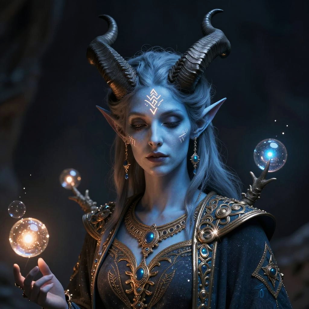 Tiefling appearance, serene and enigmatic, pale blue skin with long black horns swirling upwards, glowing rune markings on the forehead, adorned in elaborate ceremonial robes surrounded by mystical floating orbs.