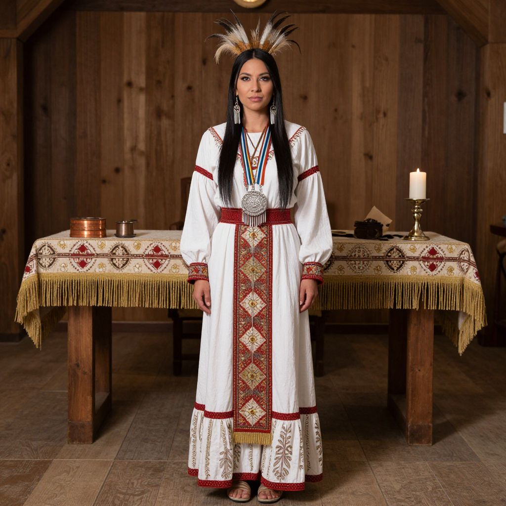 Photograph of a Native American woman standing in a wooden-walled room. She has long black hair, wears a white dress with red and gold intricate patterns, and a large circular medallion at the chest. Her head is adorned with a feathered headdress. She has brown skin and wears large, dangling earrings. The table behind her is covered with a patterned cloth, holding a candle, a small metal bowl, and a book. The room is warmly lit, emphasizing the wooden textures and traditional attire.