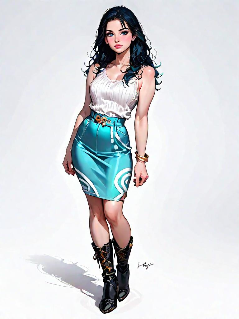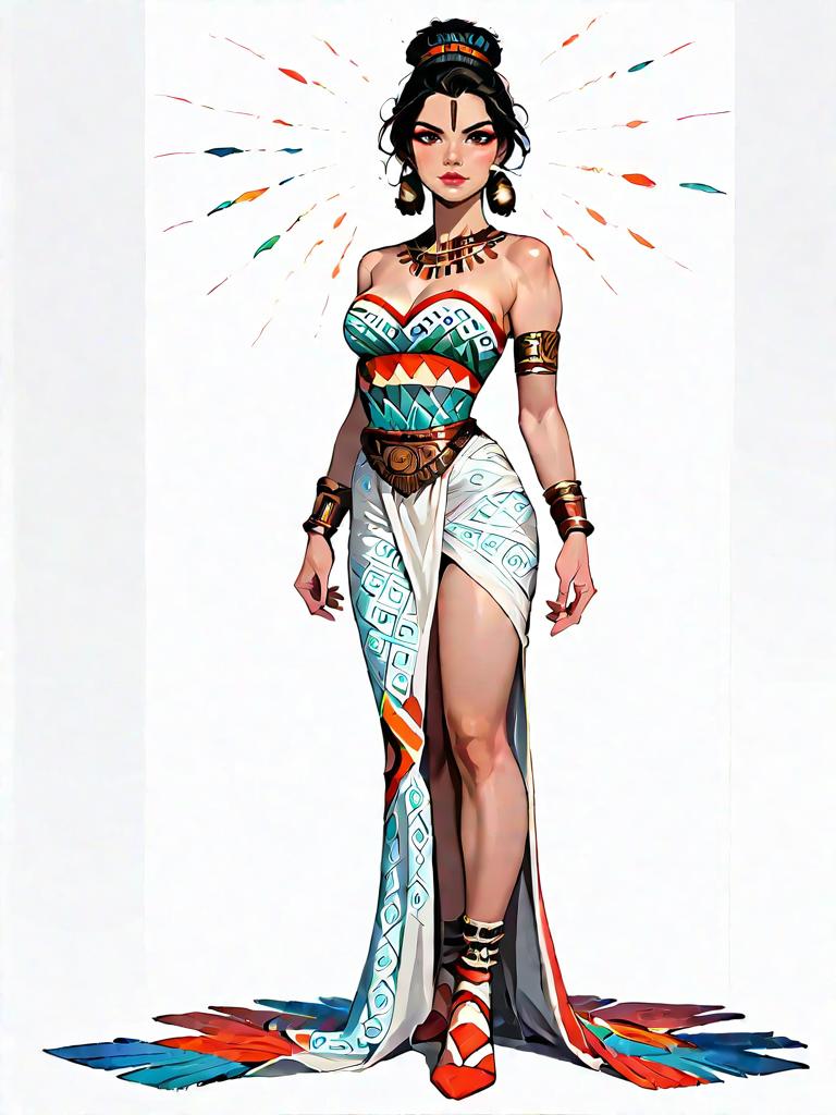 1girl, source_comics, realistic face, full body shot, Woman, casual summer style, strapless romper in red and white Aztec print, straight neckline, elasticized waist, short length with pom-pom trim, white background.