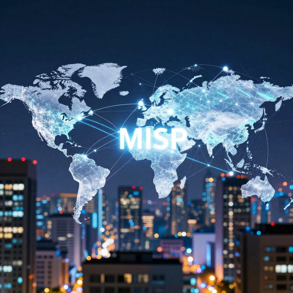 Concept art of MISP as a glowing web linking global cybersecurity data, futuristic cityscape backdrop with interconnected data points, neon-lit digital lines symbolizing cyber threat sharing, dynamic and energetic vibrant colors representing global collaboration.