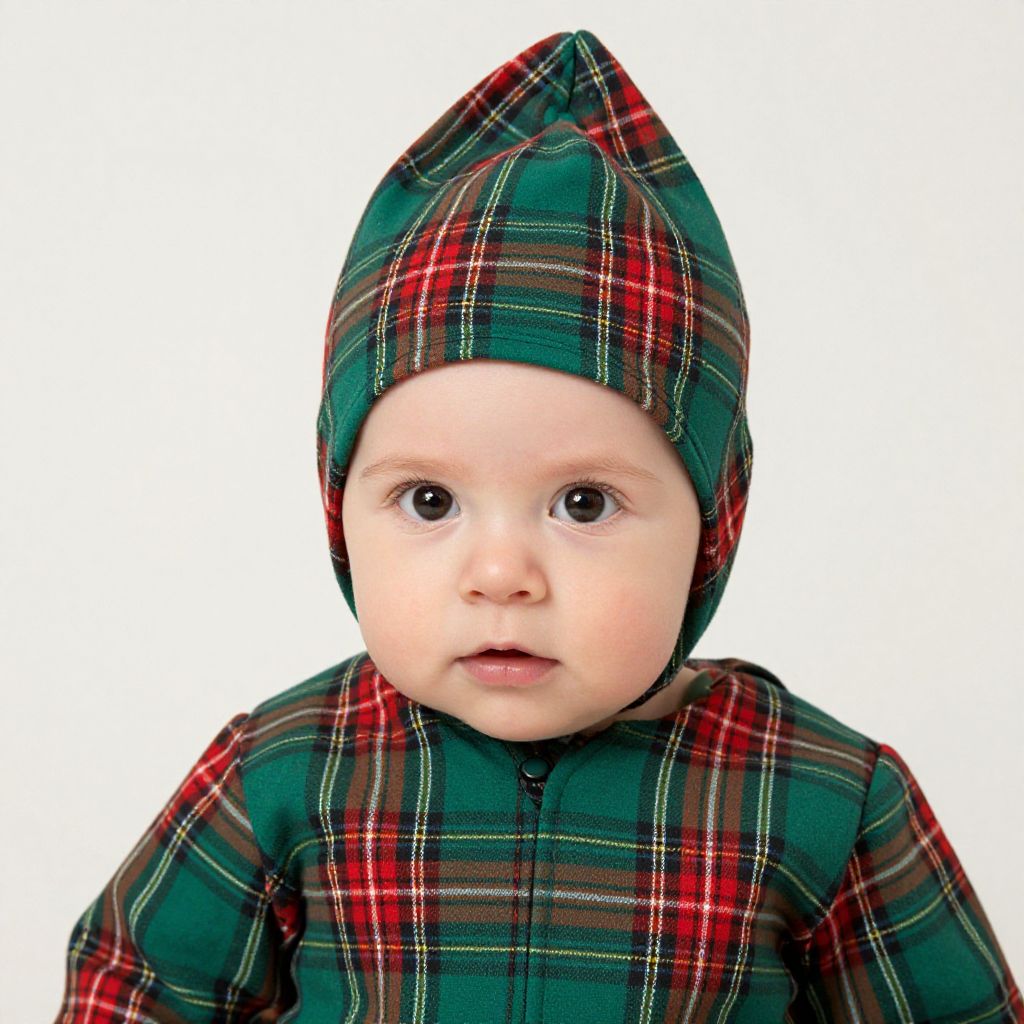 Photograph of a fair-skinned baby with large, round, dark eyes, wearing a green and red plaid hooded outfit. The baby's hood is also plaid, matching the outfit, and is slightly tilted. The baby's expression is neutral with slightly parted lips. The background is pure white, making the baby and the plaid pattern stand out prominently. The baby's cheeks are chubby, and the overall texture of the clothing appears soft and cozy. The image is brightly lit, highlighting the baby's features and the detailed plaid pattern.