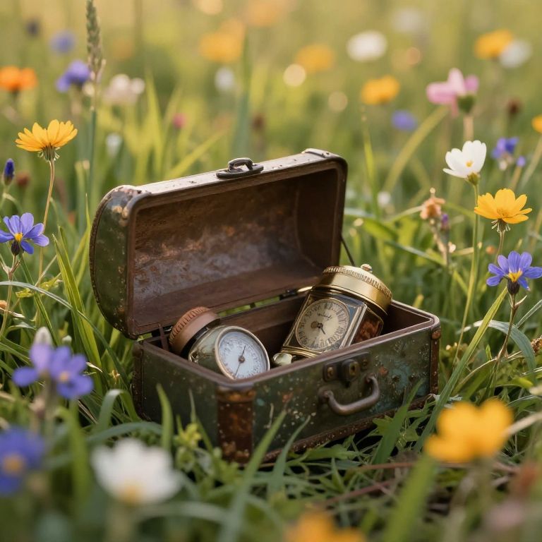 Lingerance represented by an abandoned old clock in a serene forest clearing, overgrown by vines and flowers, symbolizing the pause between moments, bathed in golden hour light filtering softly through ancient trees.