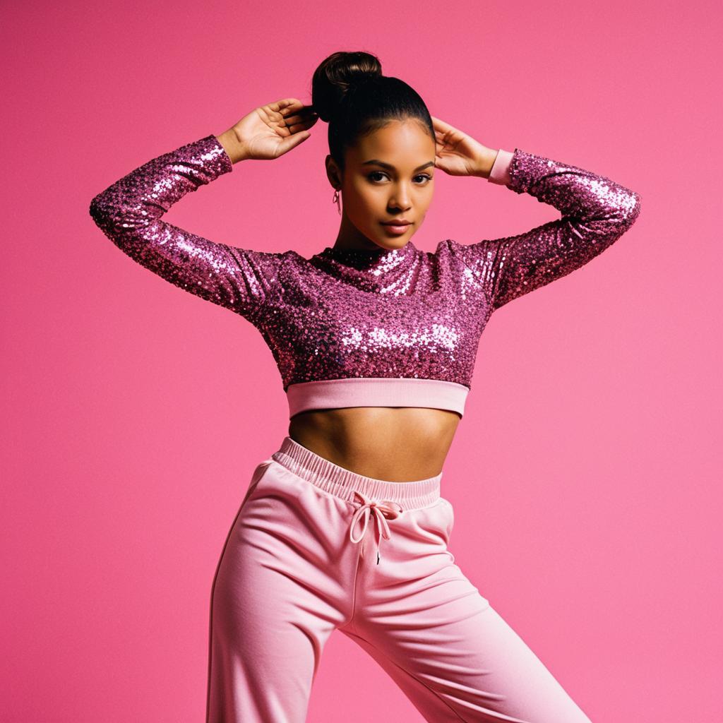 Pink jazz dance costume,1girl, solo, realistic, pink background, pants, pink pants, crop top, midriff, long sleeves, standing