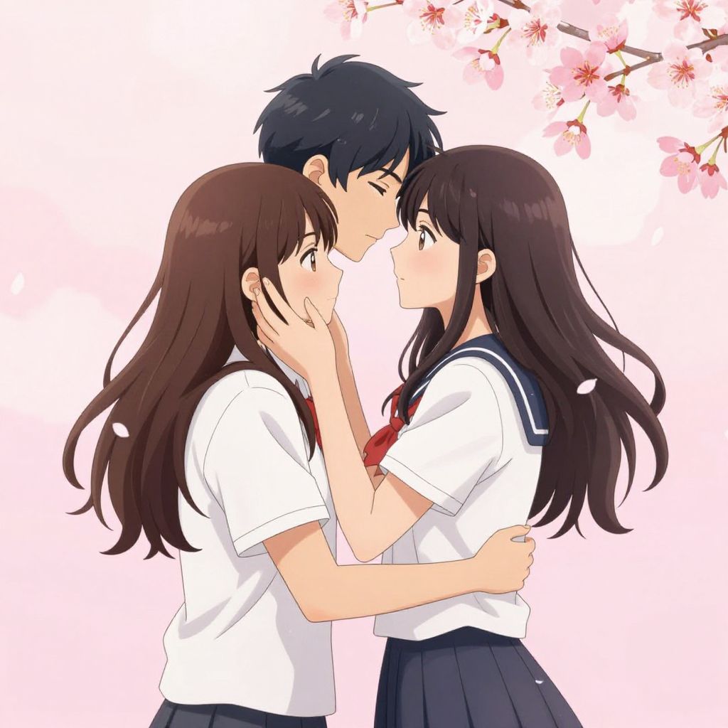 A tender anime-style illustration depicts a romantic embrace between a man and woman, set against a soft pink background adorned with delicate cherry blossom petals, evoking a sense of blossoming love and affection.