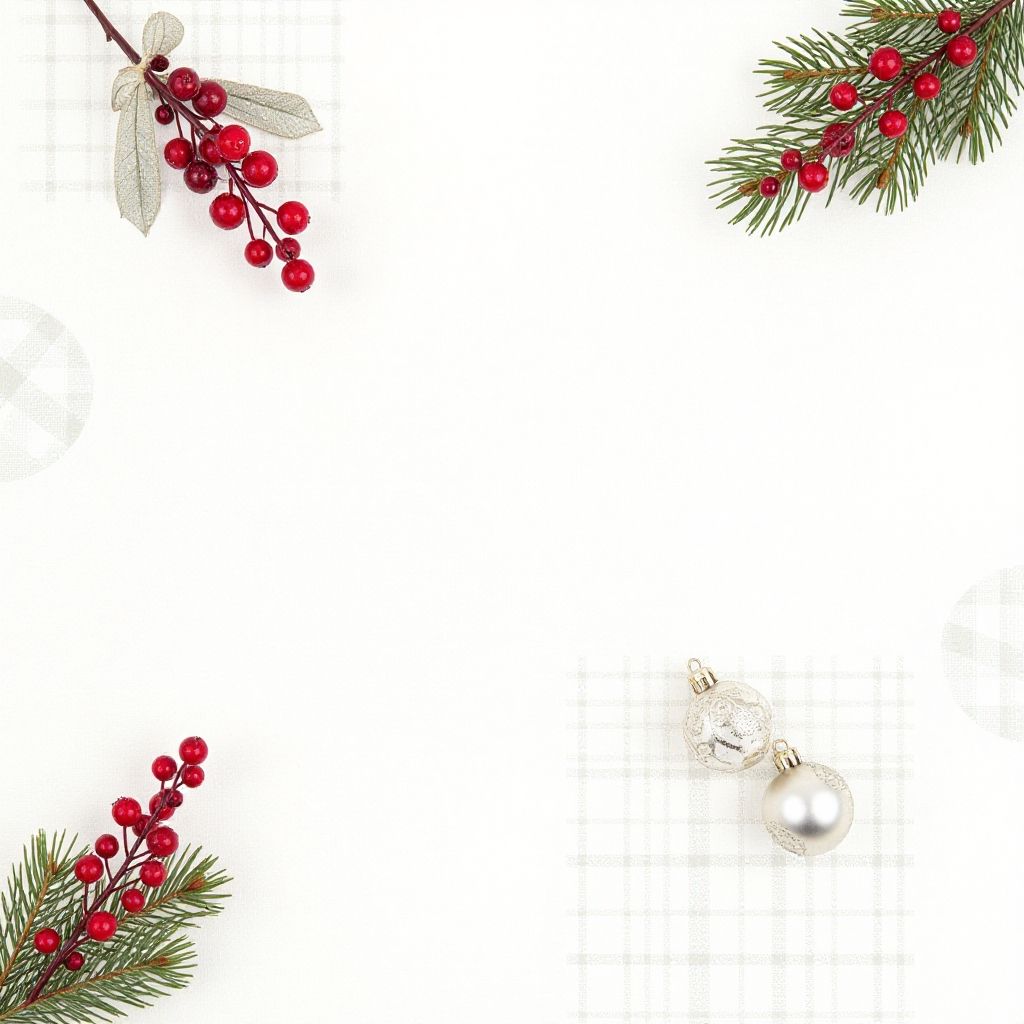 Preppy Christmas wallpaper for Chromebook featuring a minimalist composition of elegant plaid patterns combined with bright red berries, pine sprigs, and vintage ornaments on a creamy white background, with clean lines and a sophisticated holiday vibe.