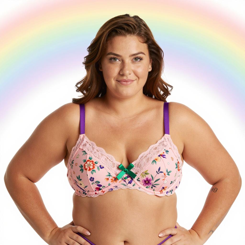 Plus-sized woman with medium brown skin and long brown hair wearing a pink floral bra with purple straps and green bow. Background has a rainbow gradient. She has a slight smile, looking directly at the camera. Her bra has lace trim. She has a small tattoo on her left arm. Her hands rest on her hips.