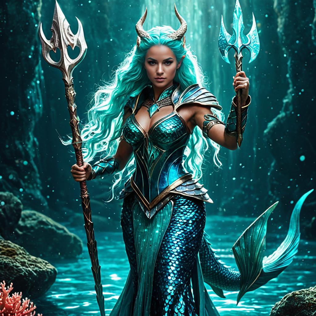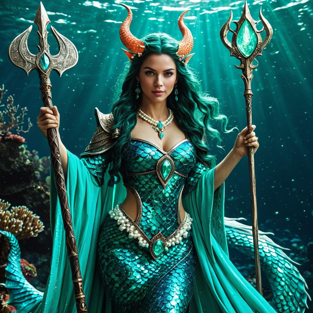 Fantasy merfolk sorceress with glossy turquoise scales and flowing sea-green robes, adorned with coral and pearl embellishments. She holds two ornate tridents with glowing gems, featuring orange horns and long wavy green hair, set against an underwater coral reef background with cinematic lighting.