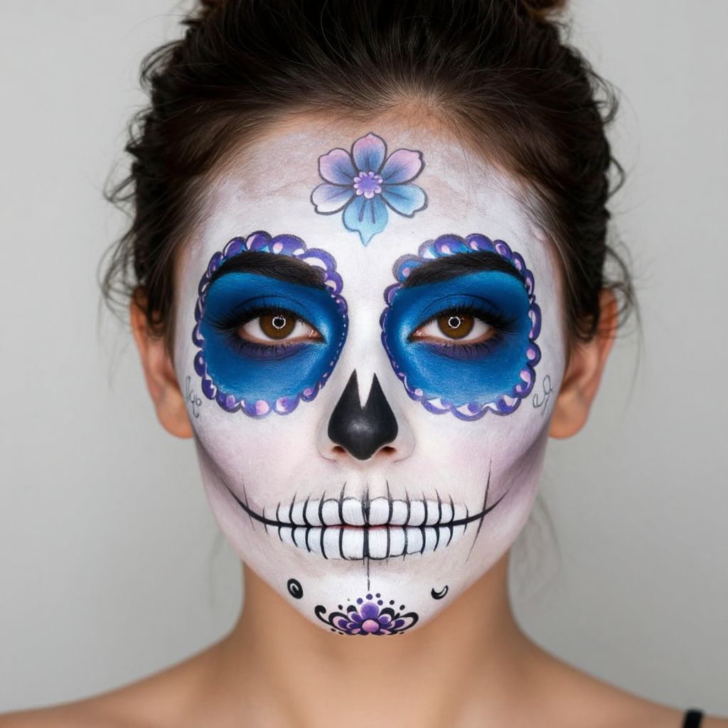 Woman showcasing intricate sugar skull makeup featuring bold blue accents, floral designs above her eyes, and detailed skeletal patterns around her nose and mouth, set against a plain background.
